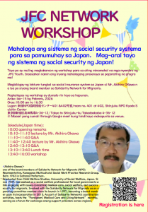 Tayo po ay muling magkakaroon ng workshop para sa ating minamahal na mga myembro ng JFC Youth. Inaasahan namin ang inyong mahalagang presensya sa paparating na programa! Magbibigay ng lekture tungkol sa social insurance system sa Japan si Mr. Akihiro OKawa na isa po siyang board member sa Solidarity Network for Migrants. Pagkatapos ng workshop ay dumalo rin tayo sa hapunan.