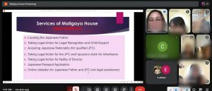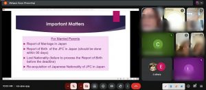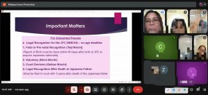During the screening process/consultation, those JFC and mothers who have sufficient evidence are invited to join the online basic orientation. The participants must understand the JFC’s rights in Japan and the assistance that MH offers before they decide to proceed. They will be required to attend the online acceptance meeting which is usually conducted on the last week of each month for their case to be officially accepted. Each client will be provided with a case number during acceptance and submission of documents.